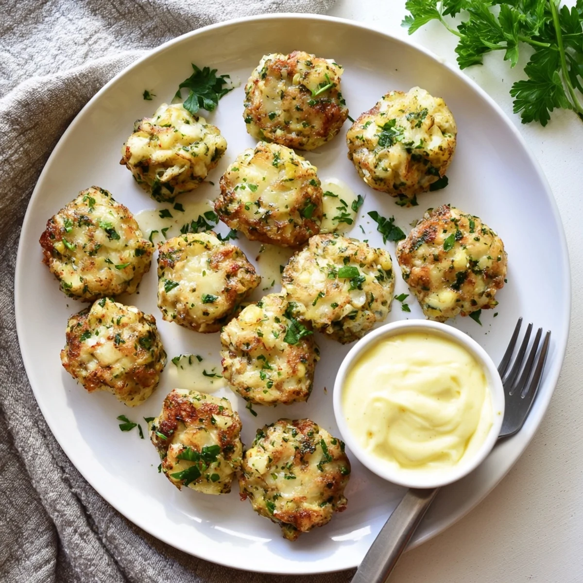 - Plate the warm fritters with the garlicky dipping sauce on the side while everything is still fresh and hot.