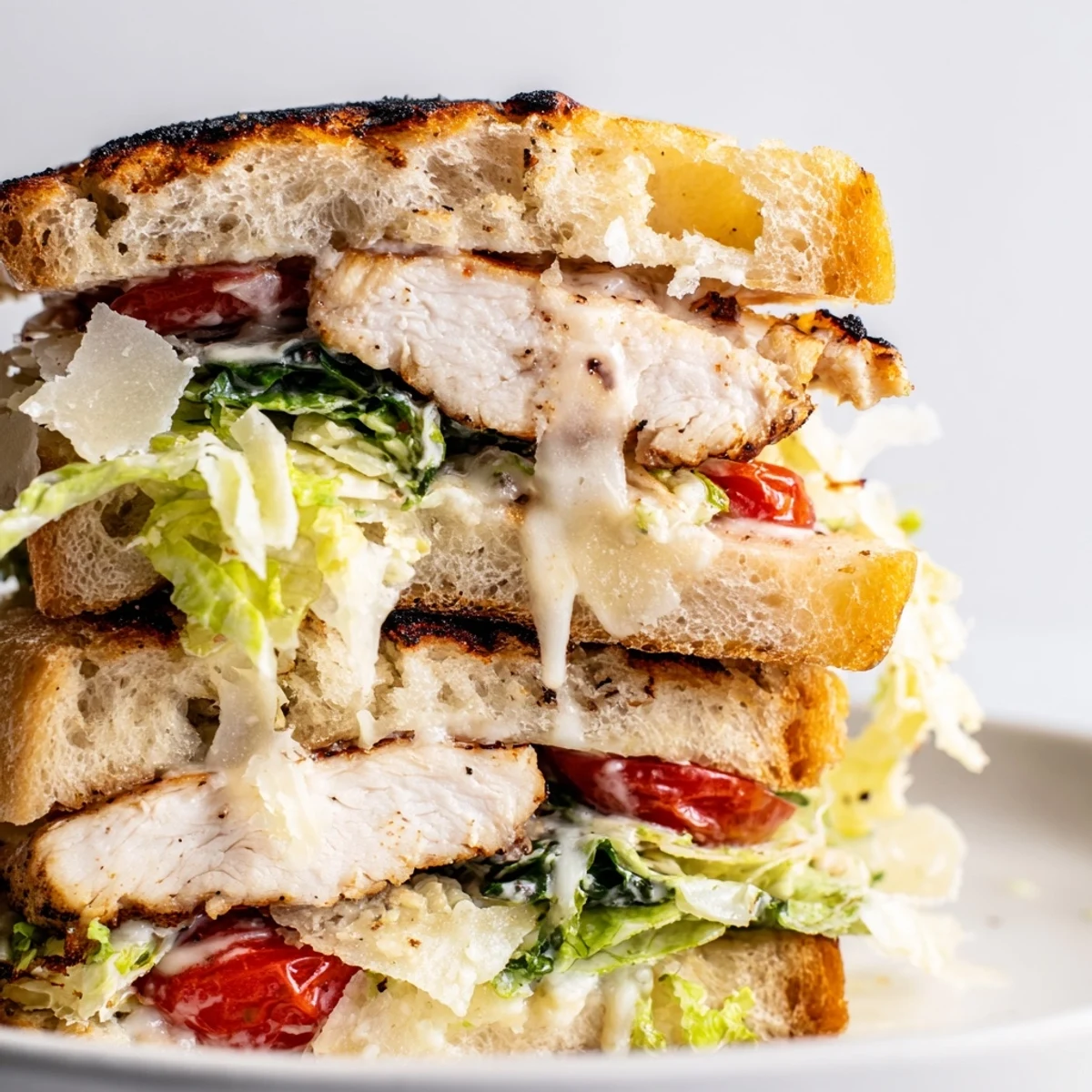 - Spread a generous layer of that homemade Caesar dressing on each roll then pile on shredded romaine sliced chicken shaved Parmesan and those cherry tomatoes if you are using them