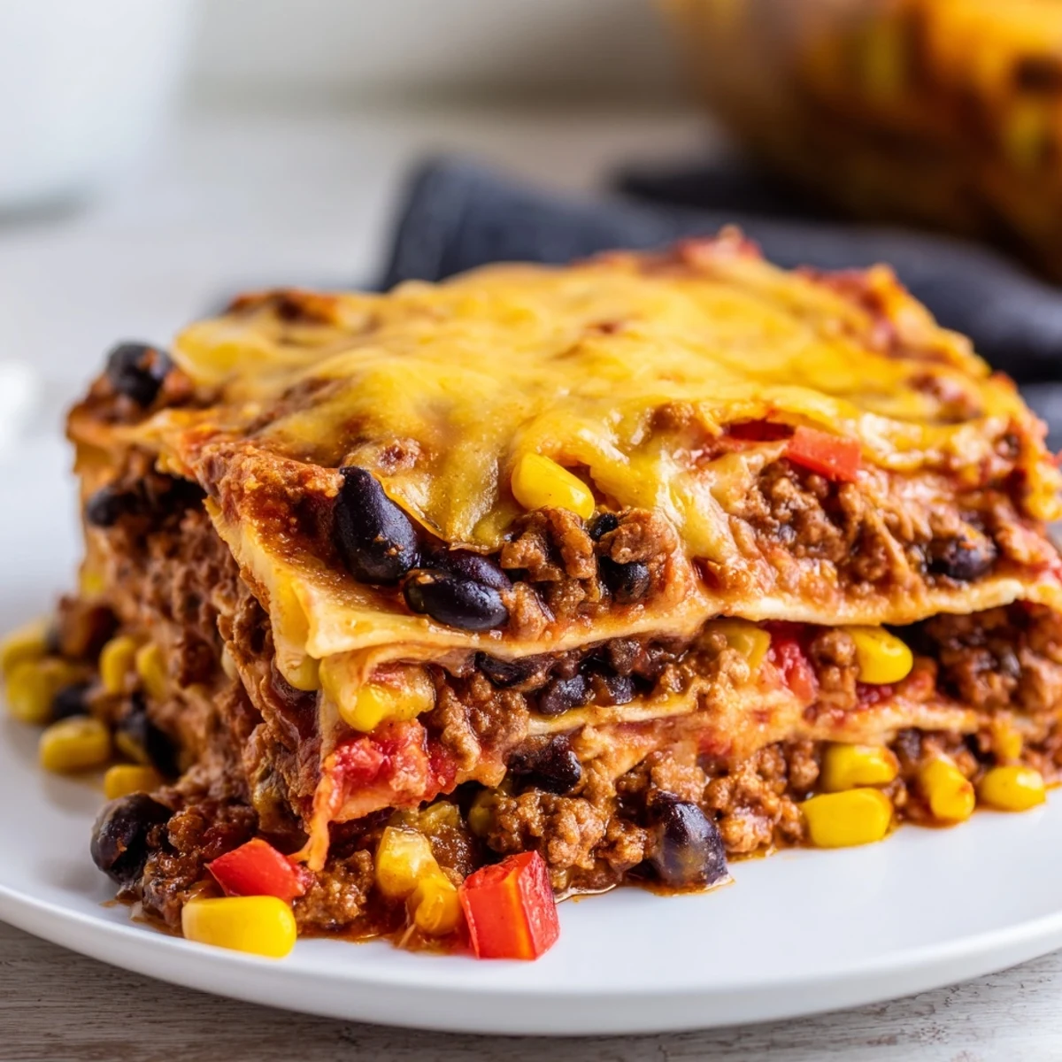 This hearty Mexican-inspired casserole stacks soft flour tortillas with a savory mixture of seasoned ground beef, black beans, corn, and diced tomatoes. Each layer is generously topped with shredded Mexican cheese blend, creating irresistible cheesy strands throughout. After baking until golden and bubbly, the dish rests briefly to set before serving. Optional garnishes like fresh cilantro, jalapeños, and sour cream add bright contrast to the rich, spiced flavors.