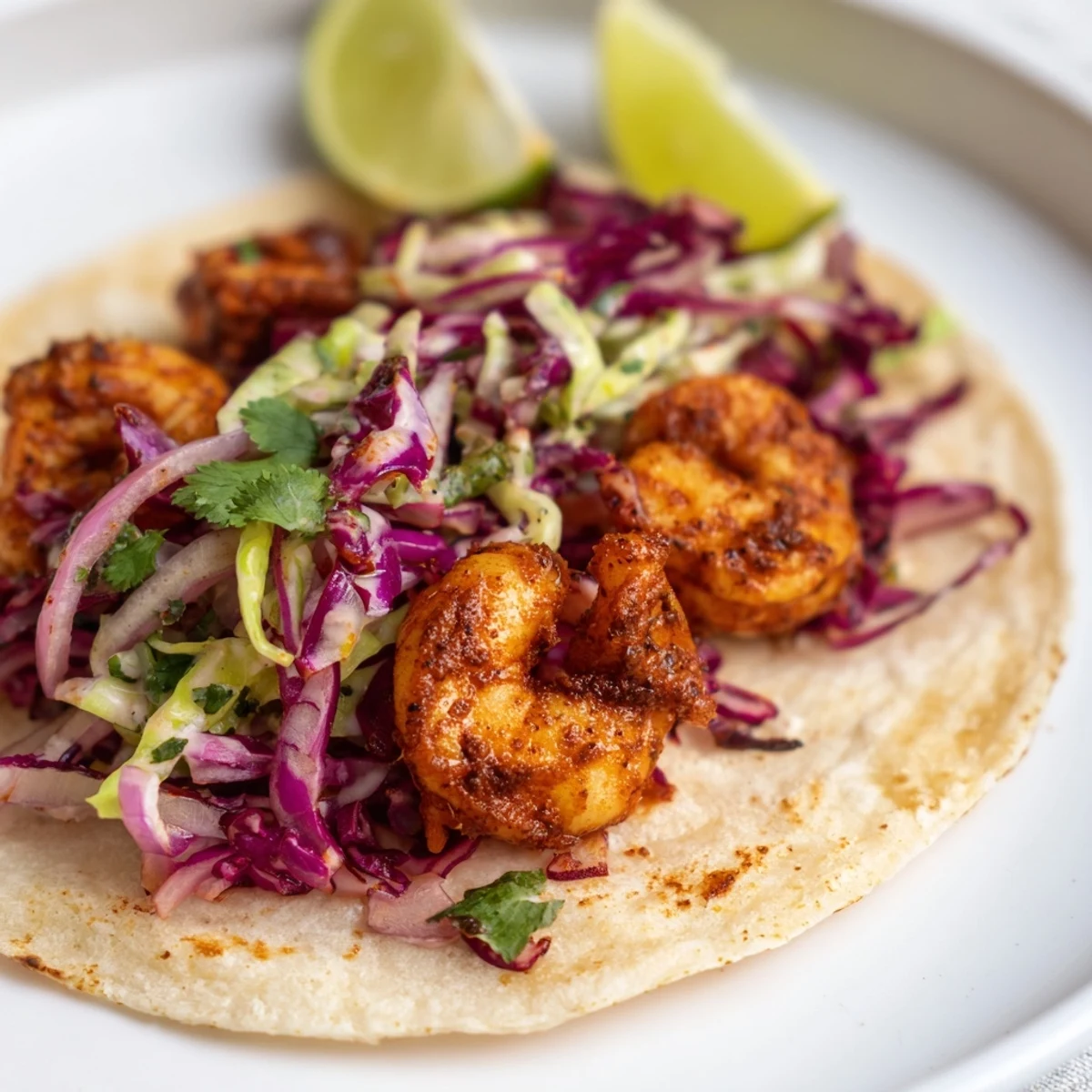 This dish features succulent shrimp marinated in aromatic spices, quickly cooked to tender perfection. They're nestled in soft warm tortillas and topped with a crisp, tangy slaw made from shredded green and red cabbage, red onion, and fresh cilantro blended with creamy yogurt and lime. Perfectly balanced and ready in under 30 minutes, it offers a refreshing yet satisfying option for any meal.